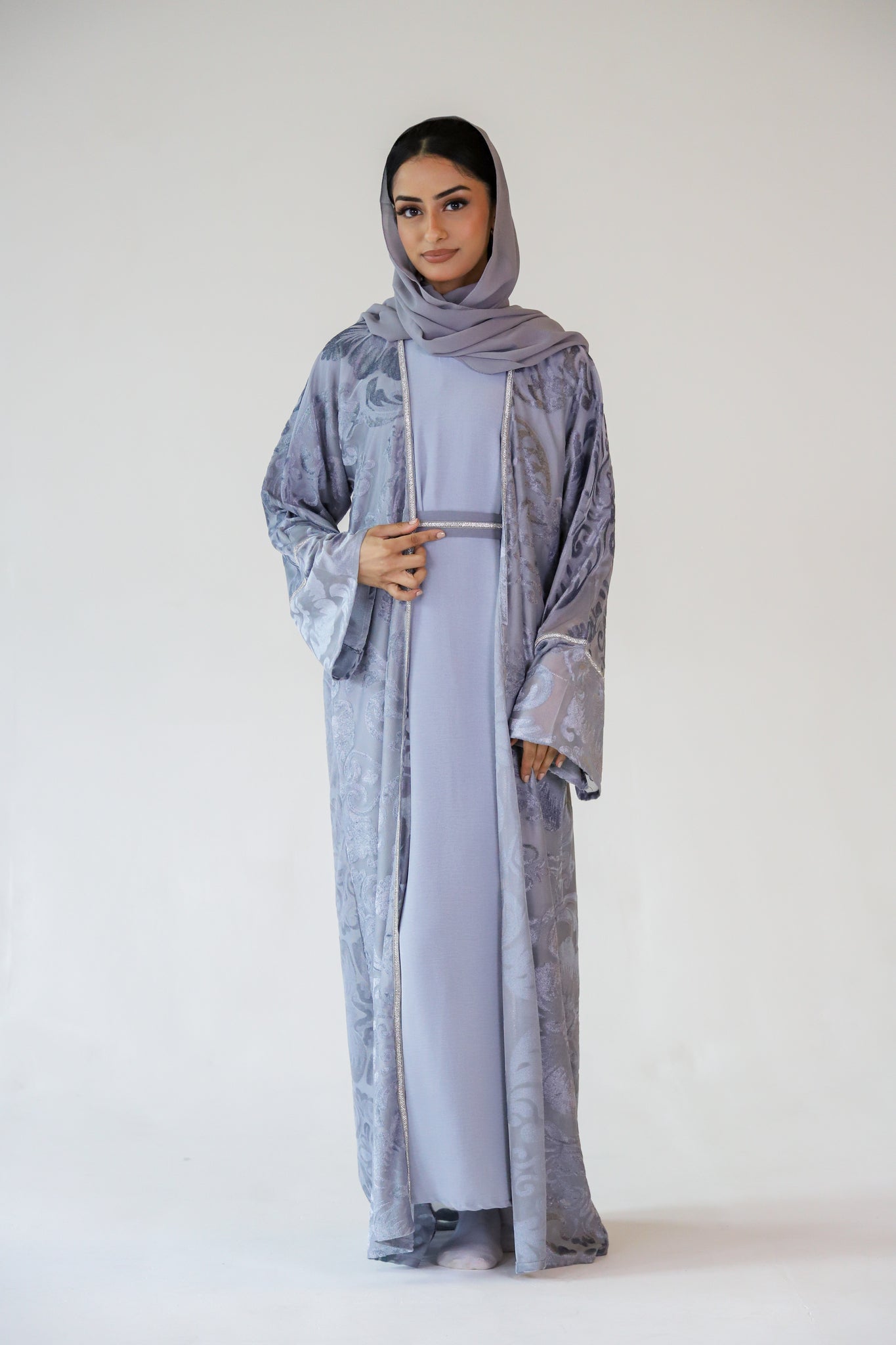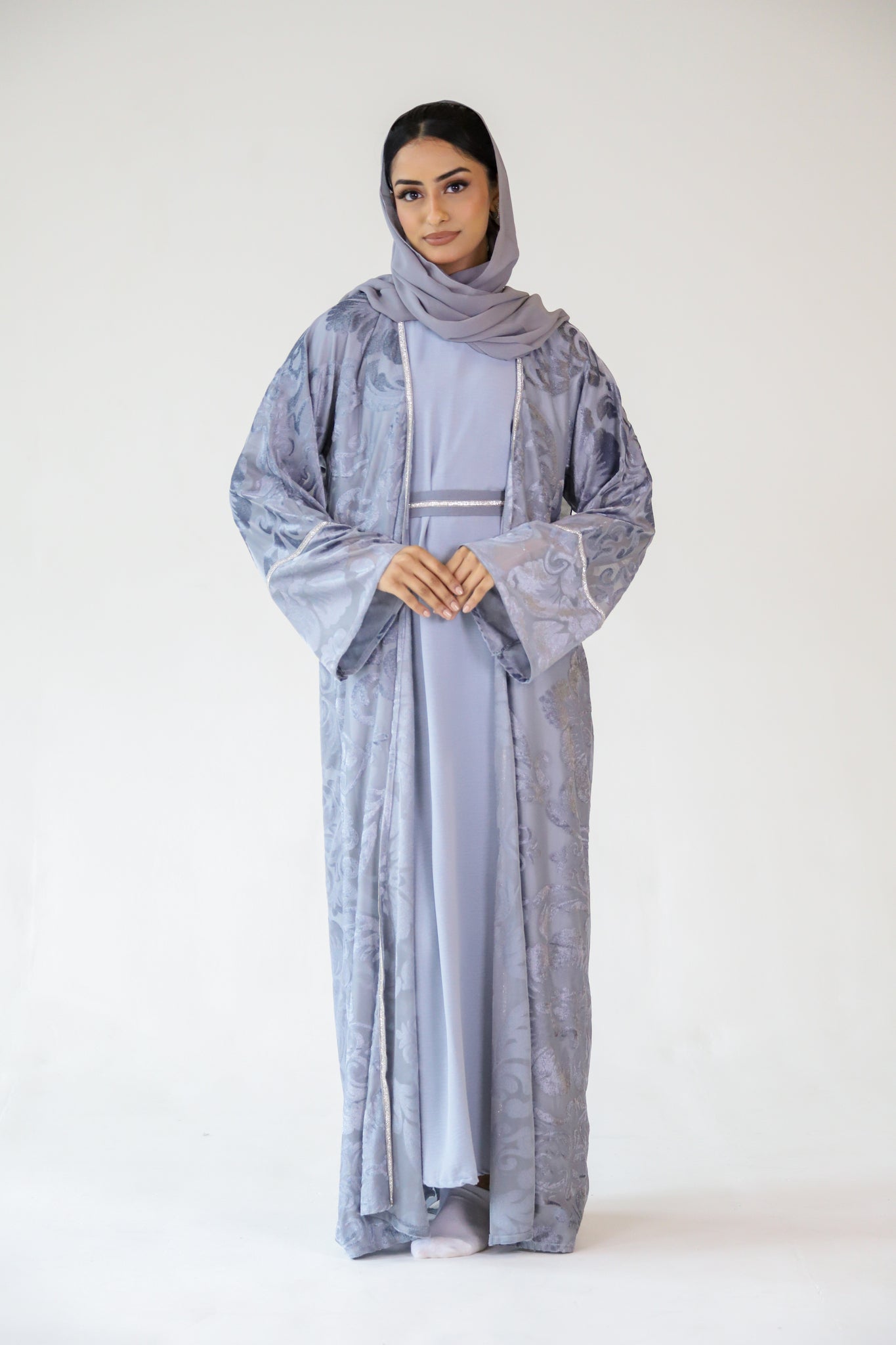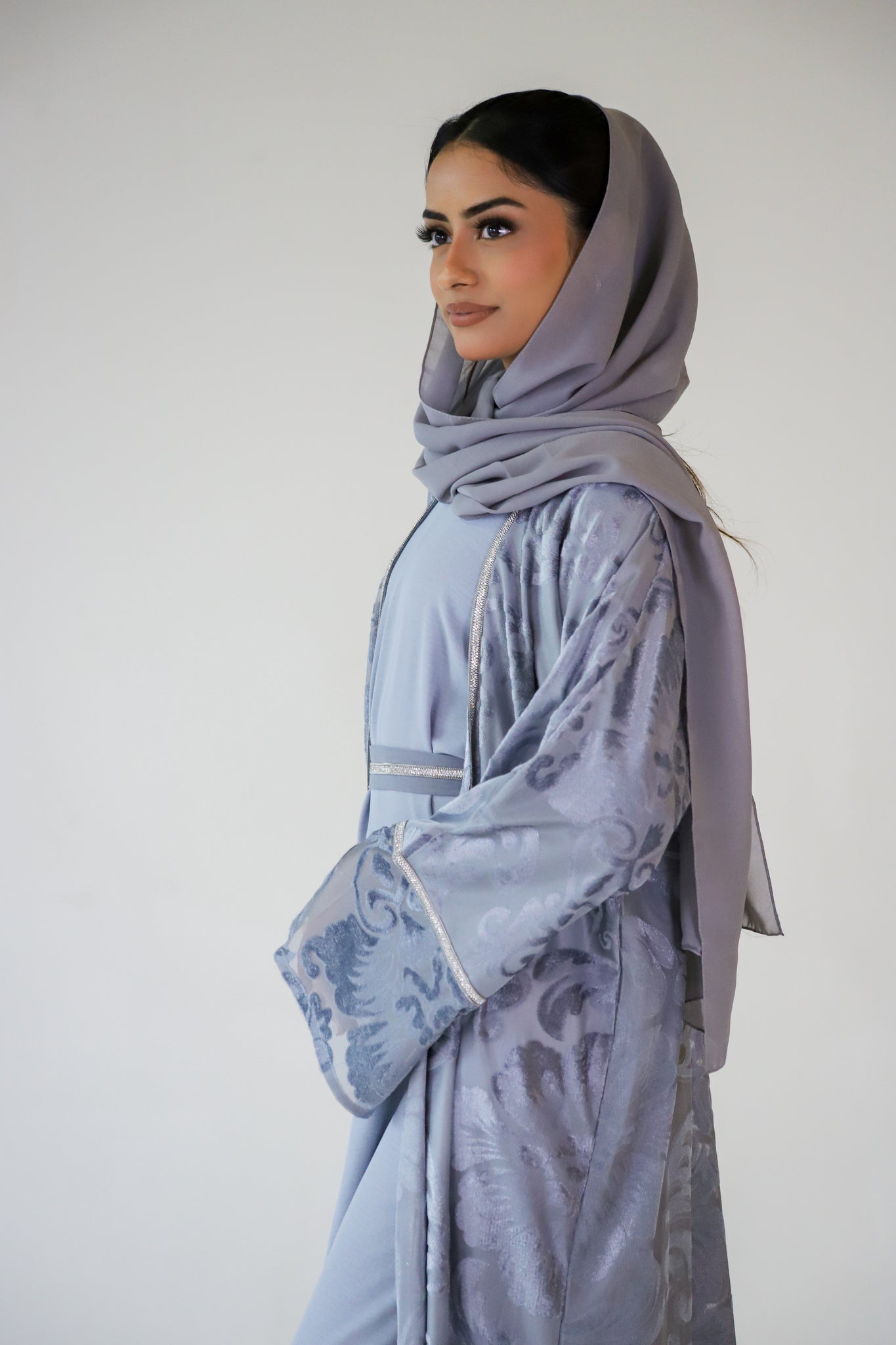 Elegant abaya with thin velvet embroidery and silver diamond lace on the front, sleeves and on belt. Perfect for special occasions, this abaya is a must have! Hijaab and inner belt provide you with the perfect blend of sophistication and style.