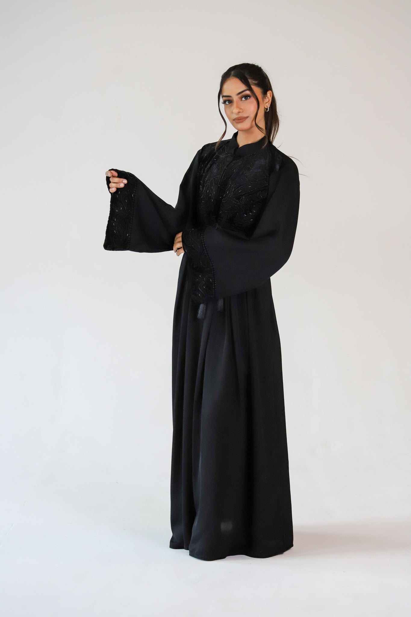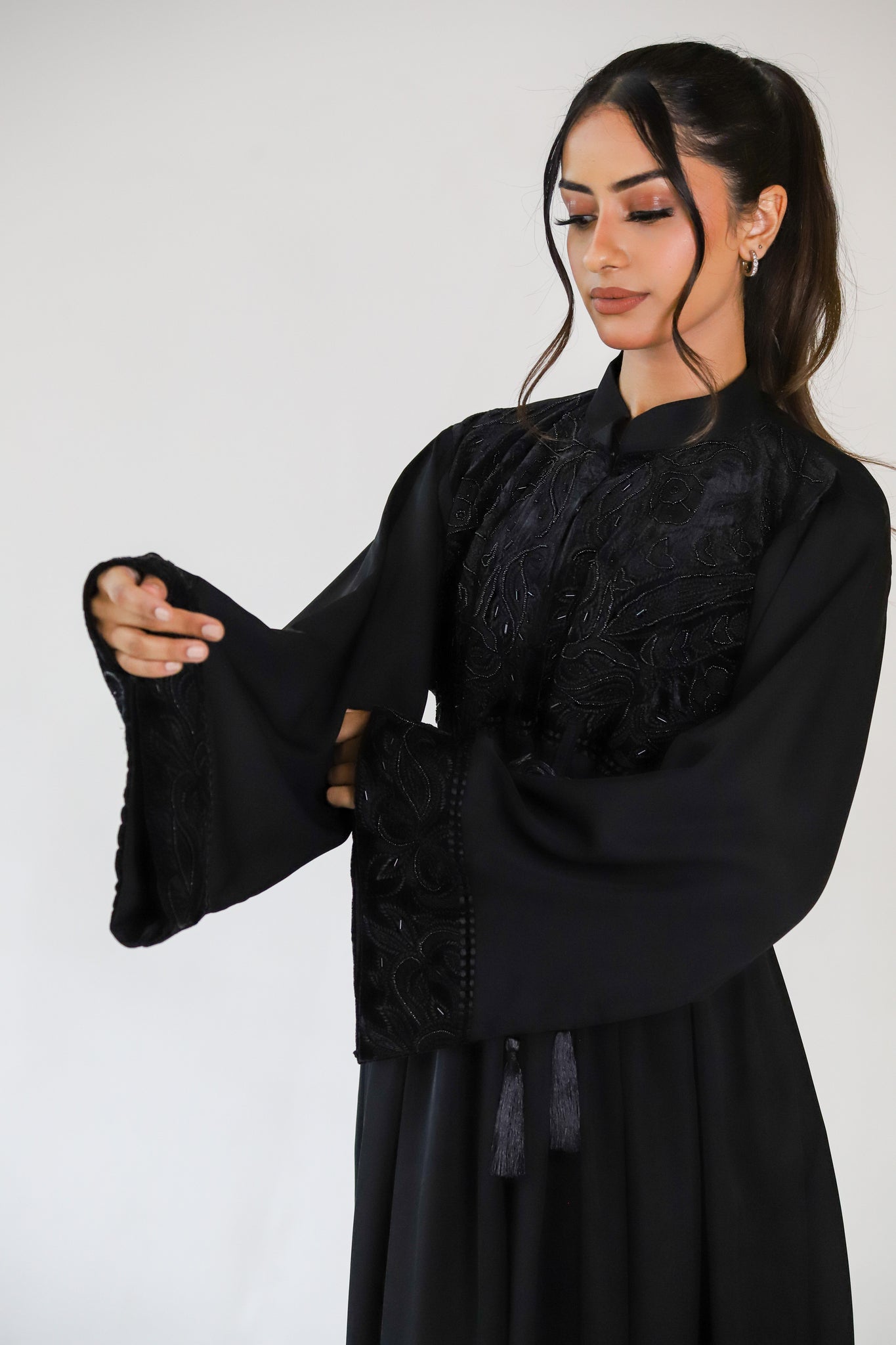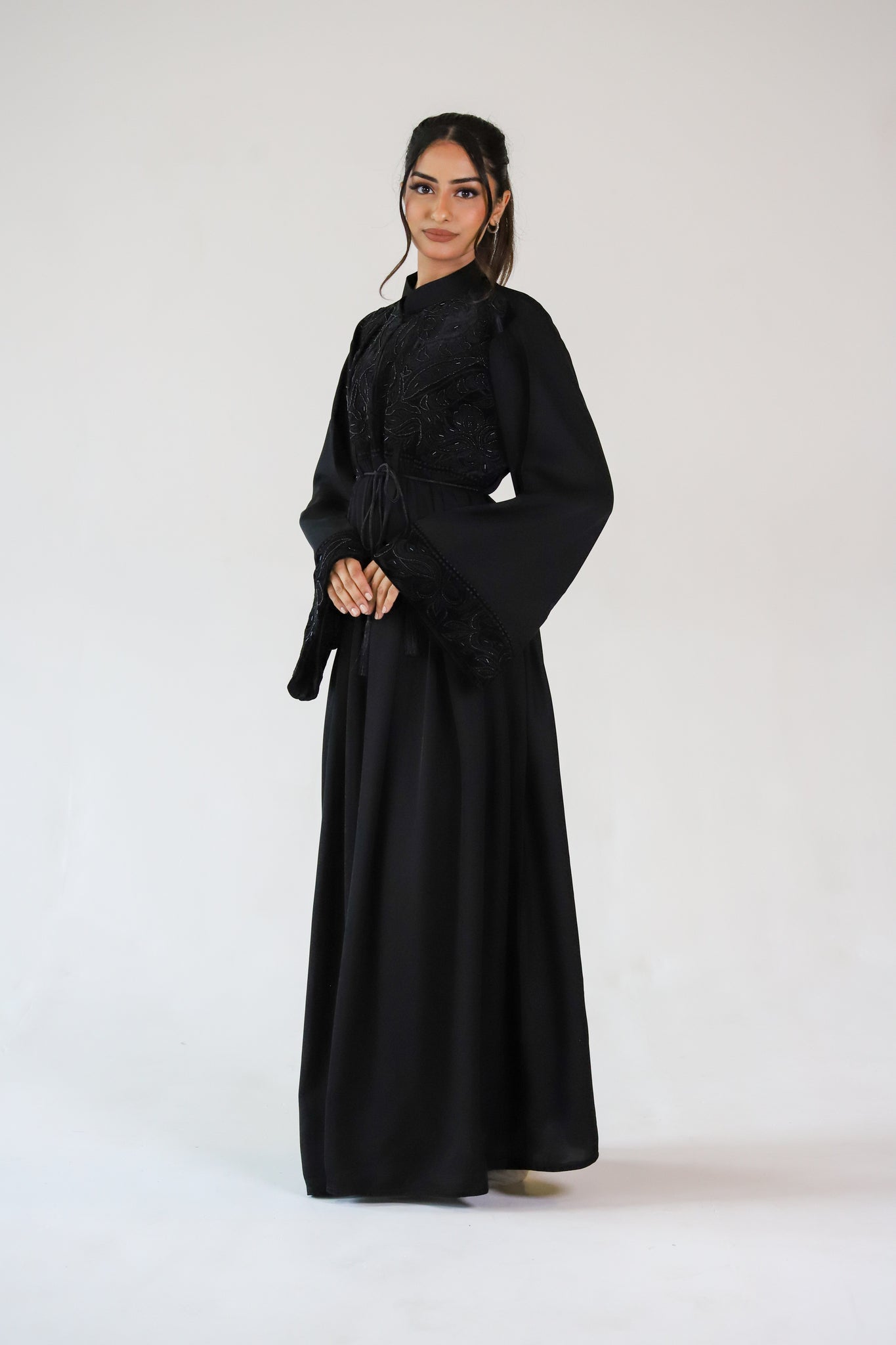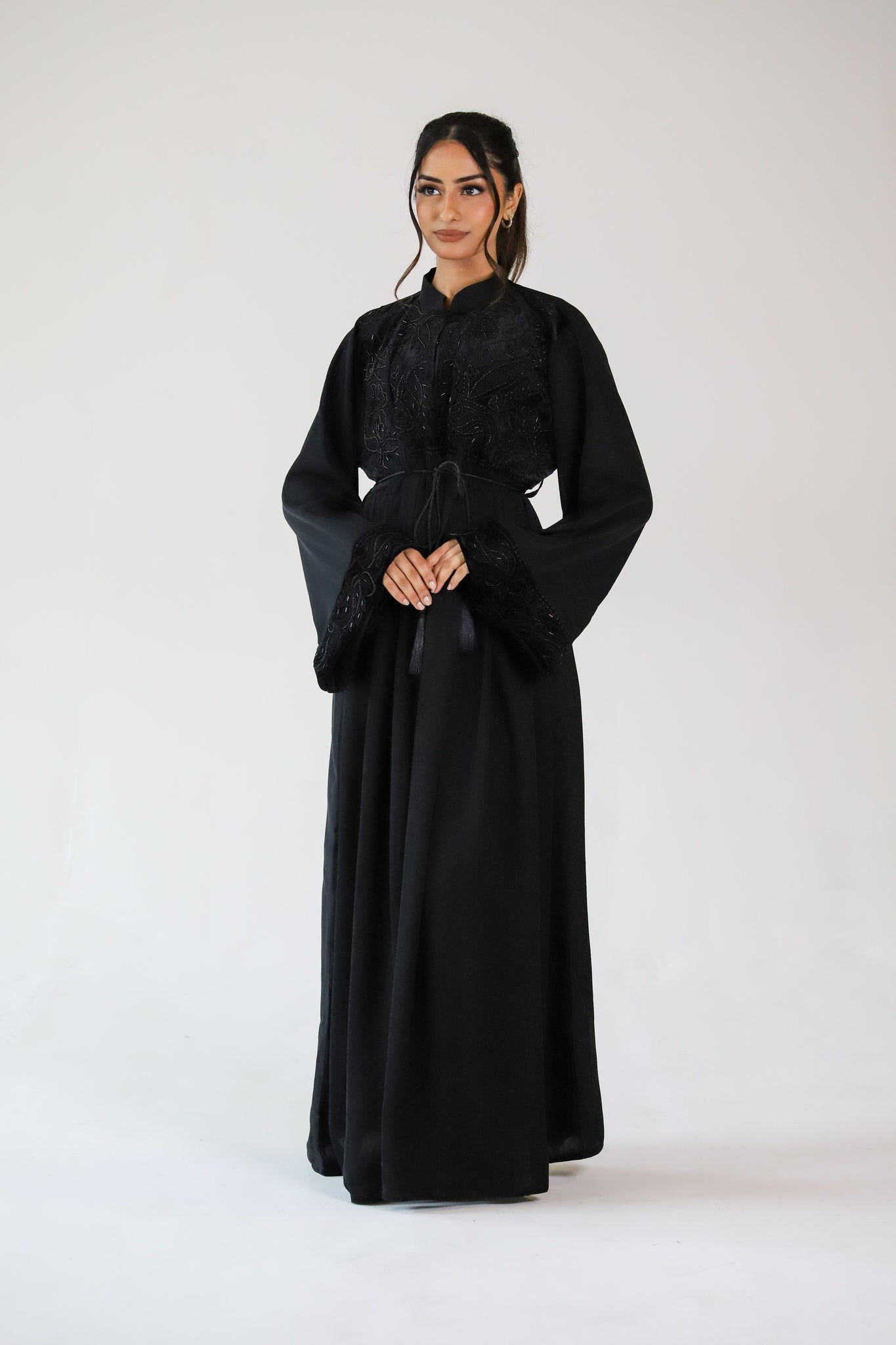 The perfect occasionwear abaya! A stunning closed abaya with a velvet upper bodice which features beautiful bead work and pretty emboss detail. The upper bodice is made up of buttons to the waist. Waist downwards the abaya is closed with pleat detailing which adds to the flare of the abaya making it extra luxurious!