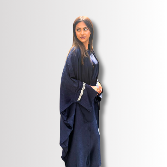 This gorgeous 4-piece abaya set includes a full length embellished abaya with wide slit sleeves, slip dress, belt and matching hijab. Perfect for versatile, elegant styling. Wide slit sleeves provide both dramatic visual impact and practical functionality, allowing unrestricted movement during formal occasions. The included slip dress is crafted from breathable fabric with a slight stretch component, ensuring comfort during extended wear while providing necessary coverage. The accompanying belt features subtle structural reinforcement, allowing for precise waist definition without compromising on comfort.
